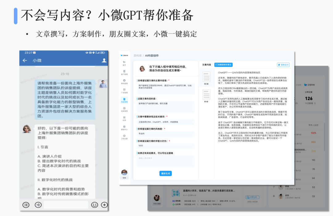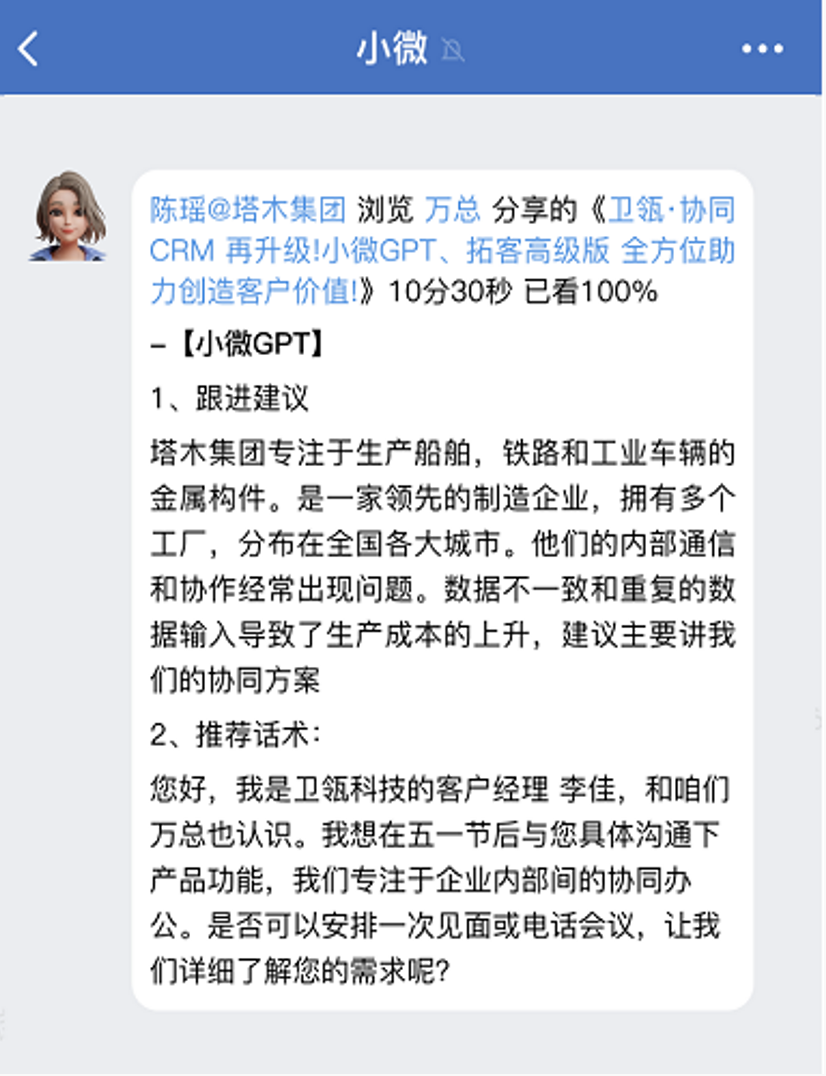销售最头疼除了跟进记录,还有报表,而这些小微GPT都可以自动生成,包括日报、周报、月报。销售少填一些报表,节省出的时间和精力就可以更多地用在跟进客户、维护客户上,这实际上也是在简化管理。