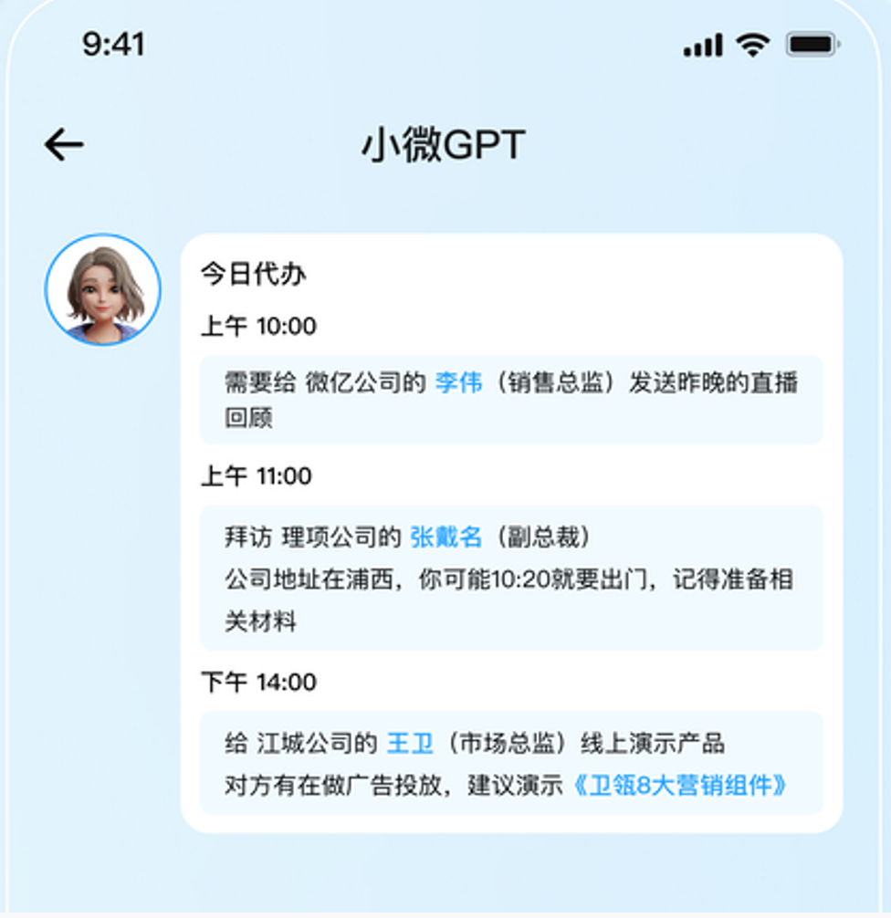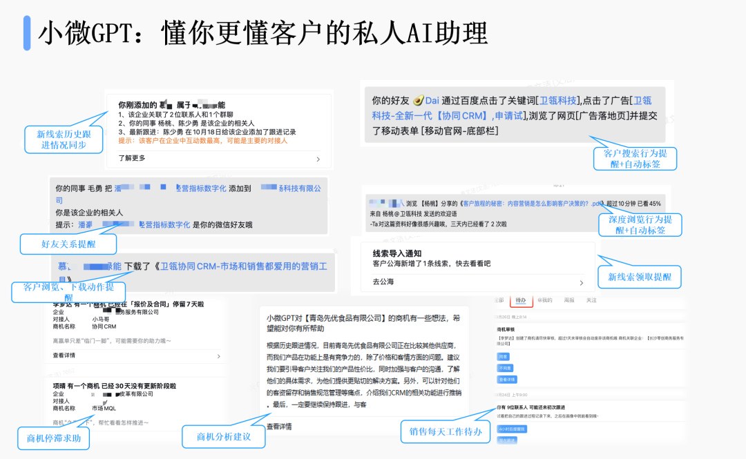 小微GPT还会帮销售记录下每个客户的跟进情况、哪些客户什么时候该联系、应该演示什么文件等等,并生成待办事项提醒,帮助销售小白掌握客户跟进节奏。
