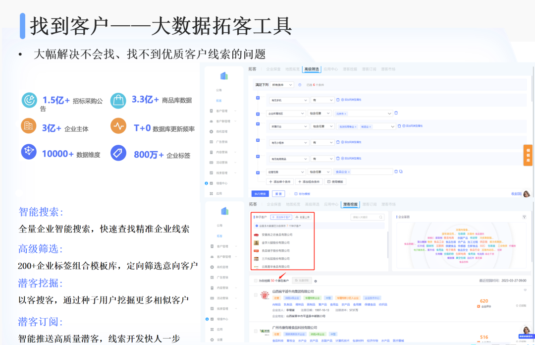 销售把已成交的客户作为种子客户输入系统,系统可以自动挖掘到更多相似客户,并将高质量潜客推送给销售。