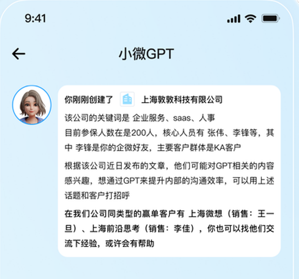 而小微GPT就可以很轻易地将这些无序的信息进行有序地整理,不仅仅帮你抓信息,还帮你去做信息背后的逻辑分析,帮助销售洞察客户。