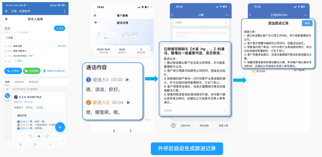 找到目标客户之后,销售的下一步动作就是与客户建联。小白销售可能会思考:我应该说些什么?这公司是干什么的?我该使用什么样的破冰话术?而今天小微GPT就可以帮助销售完成这件事。创建一个新的企业时,小微GPT会告诉你这个企业所属的行业和特征,以及其最近发生的事件或动态,然后根据这些信息,小微GPT会给你推荐有哪些关联公司和成功案例,并根据这个客户曾经看过的资料给你推荐破冰话术。话术有了,销售和客户沟通结束后,就该写跟进记录了,然而跟进记录这件事对于销售来说是相当痛苦的,所以我们选择把这件事情交给了AI。不管销售是在企业微信中与客户聊天,还是通过电话联系的客户,小微GPT都能自动总结出你们的沟通记录,自动推断出客户的态度、交流情况、意向程度,然后帮你整理出一份完整的跟进记录。