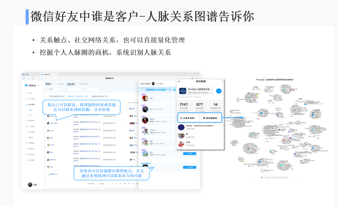 如果你是一个新销售,你的微信里加了很多客户,但却不知道应该如何挖掘出其中的潜客,怎么办?这也可以通过数字化工具来解决。ToB的内容营销是很重要的,销售将企业的白皮书、解决方案、海报等通过卫瓴·协同CRM的资料库分享到朋友圈或者群聊中后,我们就可以看到是谁在看我的朋友圈?谁在看我的内容?是深度阅读并转发了,还是只是瞄了一眼就划过去了?他是不是我的目标客户?通过这种方式,我们就可以识别出目标客户,同时也可以看到内容的传播线路,知道朋友圈中谁转发了我们的内容,他的人脉关系如何,人脉圈子是怎样的,谁是我们必须要抓住的关键人物等等。