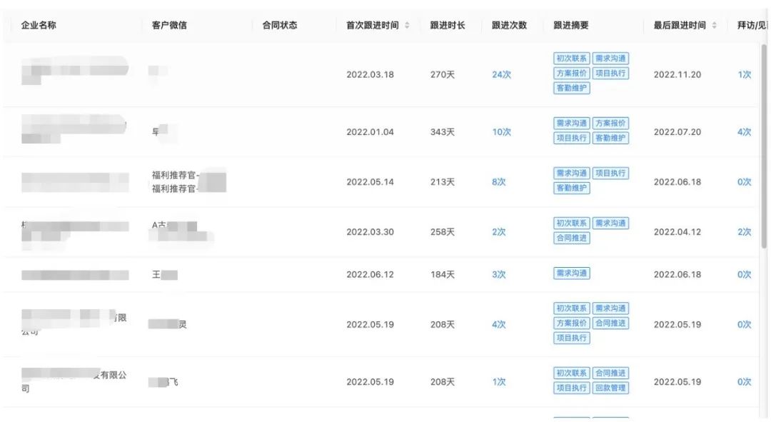 通过Open API,薪班班将卫瓴·协同CRM中的跟进记录的数据导入了他们原有的客户管理系统中。系统会自动抓取到销售在该客户下的首次跟进时间、跟进时长、跟进次数、跟进摘要、最后跟进时间、拜访/见面数等。