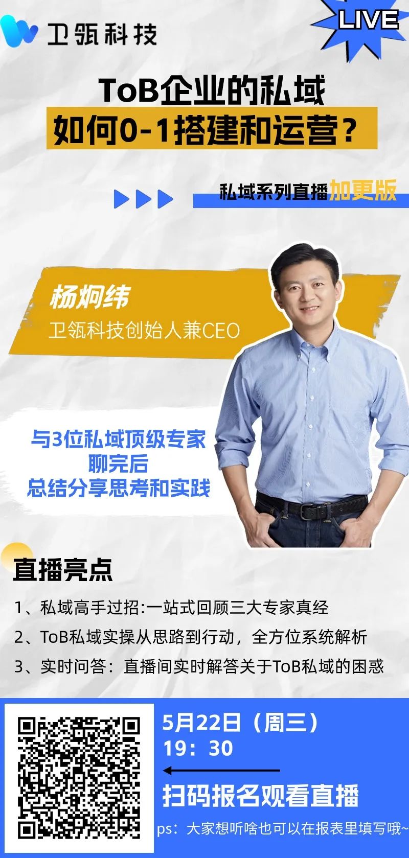 5月22日(周三)晚19:30,卫瓴科技创始人兼CEO杨炯纬将对过去3场直播进行一次总结回顾,并系统性分享关于ToB私域营销的思考与实践。