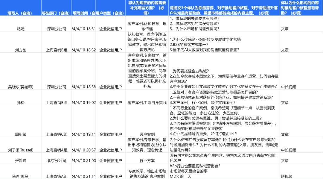 借力的第一步就是建立【内容选题库】,市场可以面向销售全员做问卷调研,了解他们在实际在跟进客户的过程中,遇到的常见的问题有哪些、他们需要哪些信息来推动客户旅程、促进客户决策和成交;以及哪些内容形式更有帮助:是更偏好短平快的视频内容,还是详尽的白皮书和案例研究等等。