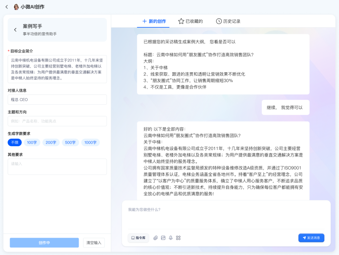采访完成之后,将录制的音频转为文字稿,初步整理之后,可以将文字稿发送给AI。根据彭罕妮老师的“B2B案例写作七步法”,我们搭建了一个“案例写手”AI Agent;将采访稿发送给AI,就会得到一个案例大纲,确认案例大纲后,AI会生成一篇完整的的案例文章。