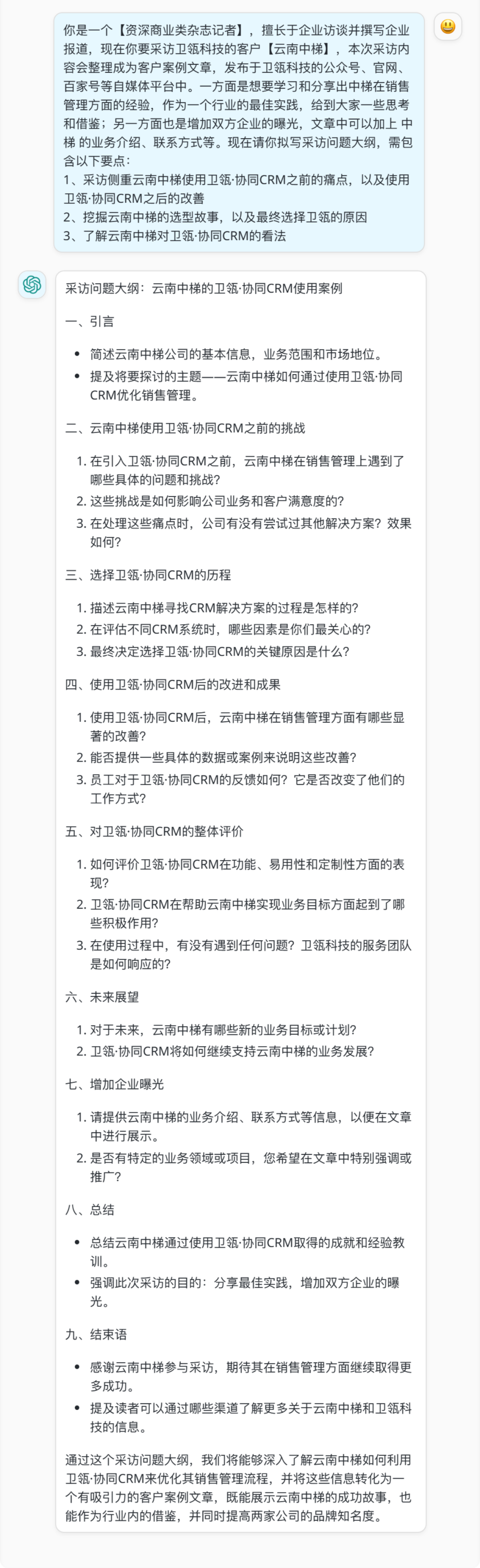 将企业简介、对接人信息、确定好的主题与方向发给AI,AI会根据我们提供的资料与想要侧重挖掘的内容,生成一个完整的采访提纲。