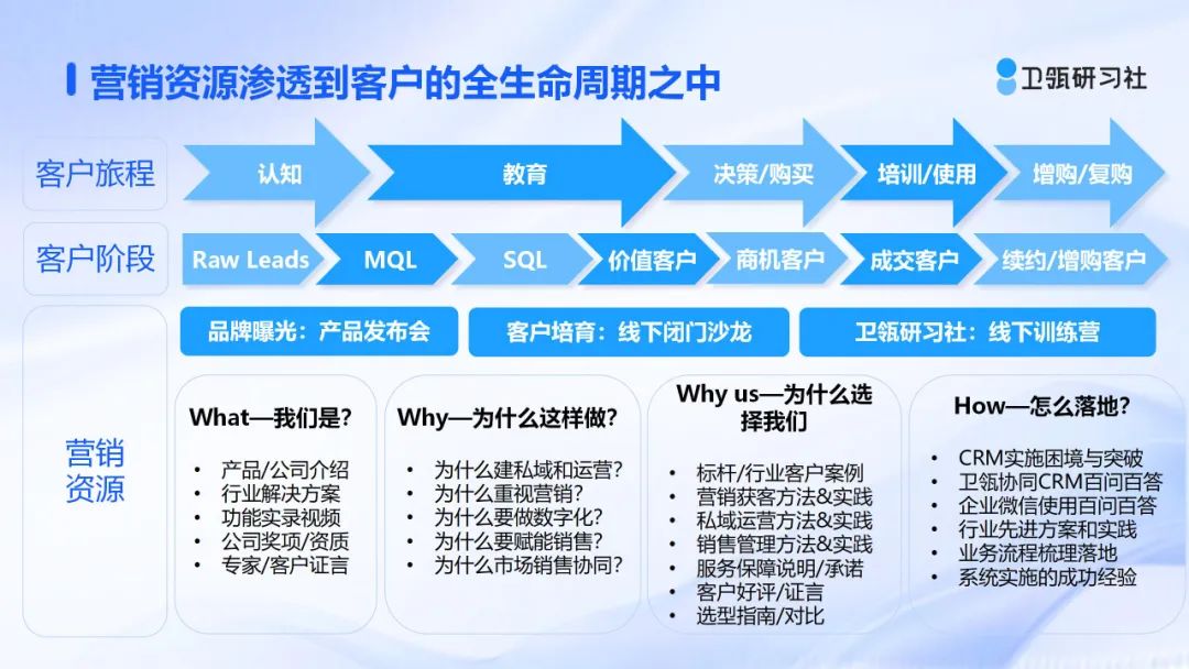 价值决定地位和话语权,B2B市场人一直在意的话语权要靠自身的实力和产生的价值去争取。如何让市场人生产的营销内容、策划的营销活动产生更大的作用?当然是把营销资源渗透到客户的全生命周期去;让处在不同客户阶段的客户都需要被营销资源去推动客户旅程,让销售愿意拿你生产的内容、策划的活动去影响客户。