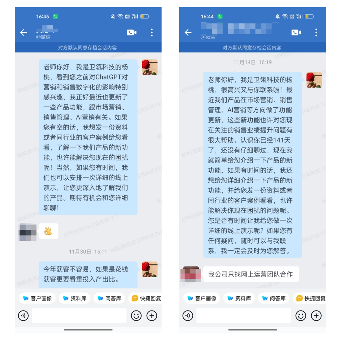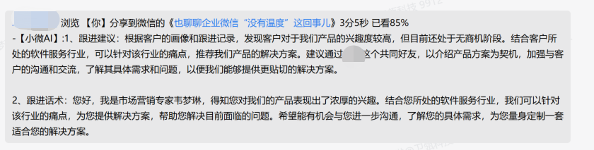 AI可以帮助撰写针对目标受众角色的个性化电子邮件模板,确保信息的相关性和吸引力。这不仅可以提高邮件打开率,还可以避免邮件被直接丢进垃圾箱。近期卫瓴在“AI生成个性化话术”方面也有了新的突破,我们尝试基于AI结合企业知识库、客户画像为各个沉默客户生成个性化话术。最终效果非常可观,超过10%以上的沉默了90天以上的客户被成功激活,并表达了进一步交流了解的兴趣。
