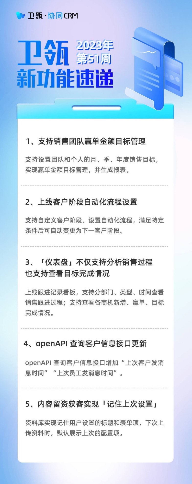 你可以要求AI根据客户当前的跟进情况,给你提出针对性的销售策略、话术建议等。AI将有能力根据公司的最佳实践、产品资料和案例等,综合给出具有较强参考性的策略意见。这将非常有助于启发销售,帮助其改善营销策略,赢得客户。AI时代正在呼啸而至,在不远的将来,没有AI加持的销售人员几乎形同裸奔。AI正在我们的销售过程中的方方面面创造价值,技术正在改变我们的工作方式,拓宽我们的机会,并使得在一个复杂销售过程中,让我们与目标受众的连接变得前所未有地容易。当今年年初ChatGPT横空出世,让我们每一个人惊叹AI原来离我们这么近,短短不到一年的时间,AI已经在我们许多的工作场景得到了落地应用,而卫瓴·协同CRM也正在以周为单位不断快速迭代我们的产品功能,也欢迎大家扫描下方二维码添加杨桃,继续了解我们的最新动向。