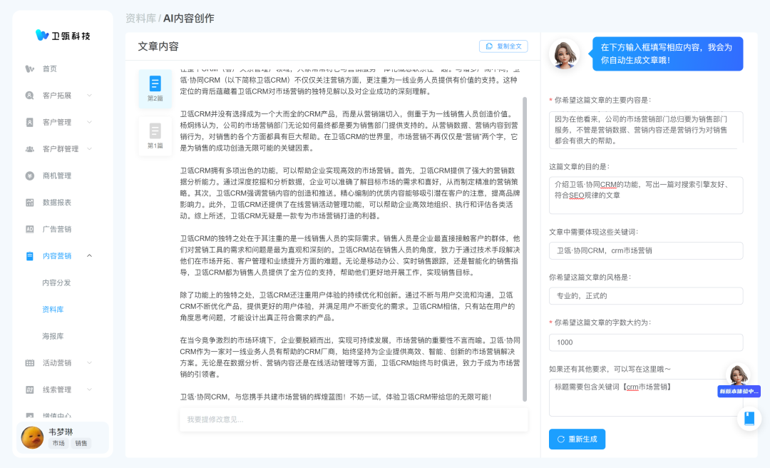 AI作为内容创作工具,可以帮助销售团队开发整个内容策略,解决特定痛点,引导目标受众向购买转化。在AI大模型的加持下,我们可以实现在不同的场合、不同的营销目的都能生产出符合场景和目的的大量营销内容生产。只需要用自然语言描述出想要的文章内容、关键词、风格等,就可以低门槛、快速地生成一篇质量不错的SEO文章。