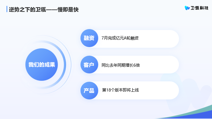 而在这样的逆势之下,卫瓴始终保持着自己的步调,慢即是快,在成立的一年八个月当中,我们完成了3轮融资,收入实现了6倍增长,产品也即将迎来第17次迭代。