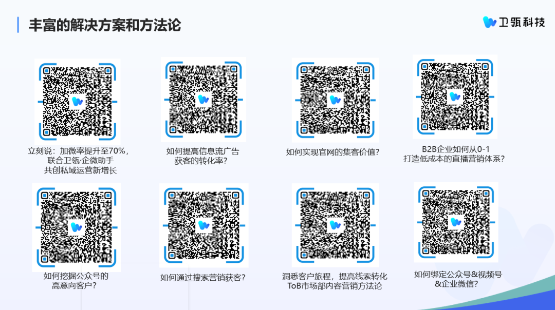 专注ToB。市场上有部分公司,不管是大客户小客户、toB 、toC,都可以提供一站式全能解决方案,但这也会导致产品的功能逐渐趋同。而卫瓴只专注于做中型或者中小型的 ToB 公司,这个定位明确以后,产品的功能也就会更加聚焦。