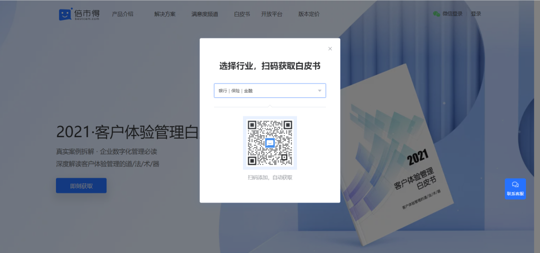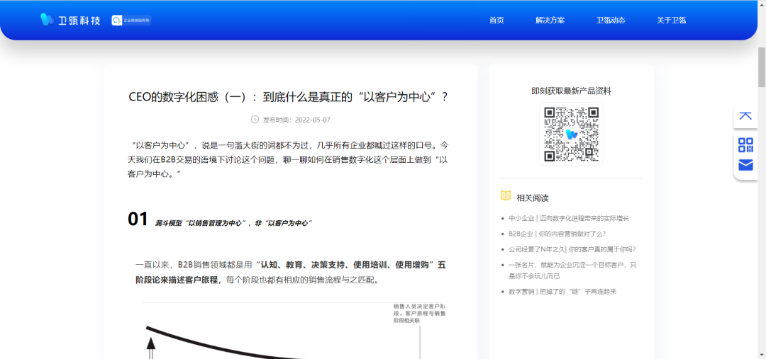 网站的内容是官网中最关键的部分,我们不能只是自嗨式介绍自家公司产品和解决方案有多好,而要去考虑访客为什么点击进来、想要得到什么信息、我们该如何满足他的信息需求;同时也要考虑如何和访客建立进一步的联系,将流量沉淀为商机。从这两个角度,我们详述一下网站内容建设需要注意的2个点:罗兰贝格在《B2B销售的数字化未来》报告中指出,首次接触销售人员之前,用户会独自完成整个购买流程的近57%,90%的B2B买家会在网上搜索关键词。原则上来讲,我们的标题与关键词匹配度越高、内容中的关键词越多、内容越优质,在搜索引擎中就会更容易得到靠前的排名。(关于搜索营销的更多干货内容,可以找文末小姐姐领取资料《搜索营销获客手册》)所以在做关键词营销的过程中,本质上要思考的就是用户会怎么样来搜索自己的需求。我们可以借助相关搜索、关键词工具等,观察用户的搜索习惯,并选择适当的关键词(通常是描述品牌、产品、网站或服务的词语)。在构建内容之前,准备好关键词库,再围绕关键词,结合品牌价值撰写内容,这也就是网站SEO的部分工作。此外,配合着SEO工作,我们还需要在多个渠道同步进行内容传播,在知乎、百度问答、行业论坛等公共平台发布优质内容,通过持续传播而为官网带来更多流量。我们经常会在官网见到各种咨询窗口、沟通工具,等着访客主动发起咨询请求。但是这种设计却忽略了一个问题——在兴趣阶段,客户对你没有一定程度了解的情况下,主动发起沟通是有很大的心理成本的,沟通也需要准备。这类客户处于了解产品的初期,首先想要做的是了解专业知识、研究产品方案、备选供应商、估计预算范围,并不倾向于和每个厂商主动发起一对一的沟通。针对此种情况,我们可以在官网建设多个触点,也就是埋下内容“钩子”,这些钩子扮演着线上顾问的角色,引导企业网站的访问者更深入地了解企业产品或服务,吸引他们主动进入企业私域。他们在网站中设置了大量的白皮书、视频资料、营销工具的领取按钮作为触点,点击后会被邀请填写电子邮件等信息,之后可以下载文档,这是一种典型的集客营销方式。将此方式转变为更适合国内的场景,我们可以在网站内容中适当的位置插入白皮书、指南、电子书等资料的下载链接,吸引客户扫描二维码直接领取资料。(卫瓴客户倍市得完成官网改造后,1个月内线索转化率实现超20%提升。想了解他们是怎么做的,可以扫描文末二维码领取客户实战案例哦~)客户倍市得官网案例:「PC官网」-「白皮书」-「扫码自动获取」卫瓴科技官网案例:「搜索引擎」-「官网文章」-「扫码领取相关资料」这样的方式区别于传统的「官网」-「下载资料」-「填写表单」的留资渠道,传统的表单电话对访客来说也是一种被动接受的转化形式(要等着某个销售打电话过来),而扫描二维码加企业微信的方式,则是将是否建立“好友关系”的选择权给到了客户,给予客户更多的主动性。同时因为少了“销售打电话”这一线索流失率相当高的环节,也让线索转化率得以提升。